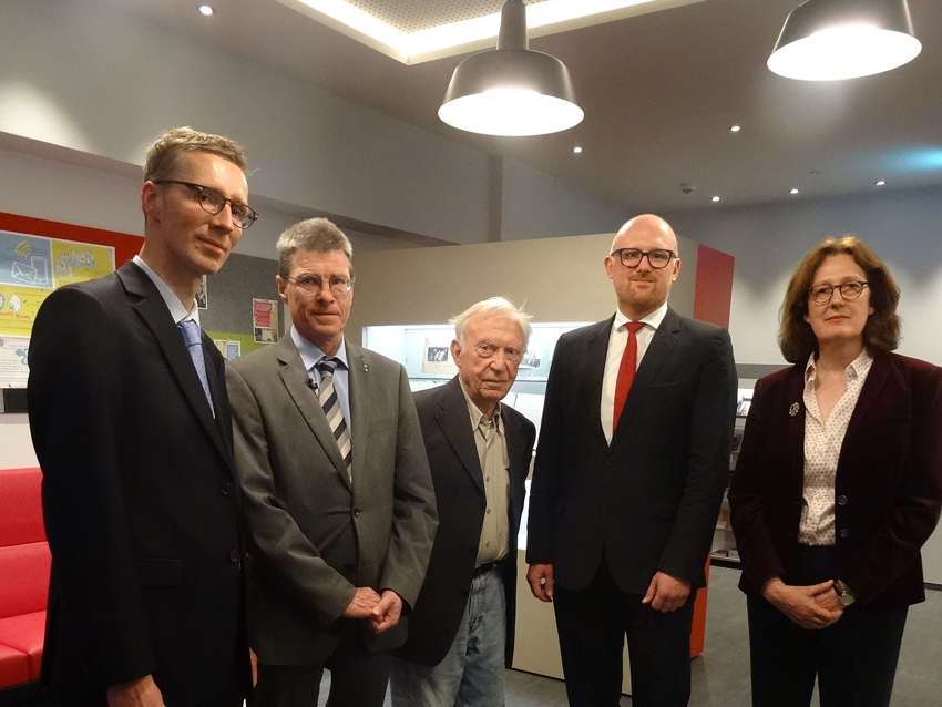 Offizielle Eröffnung des Zentrums für Erinnerungskultur (v. l.): Dr. Andreas Pilger (Direktor des Stadtarchivs), Kulturdezernent Thomas Krützberg, Alt-Oberbürgermeister Jupp Krings, Oberbürgermeister Sören Link, Dr. Susanne Sommer (Direktorin des KSM). Foto: Petra Grünendahl.