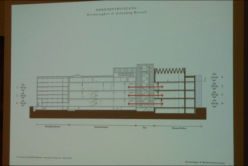 Entwurf von Herzog & de Meuron: Gebäudestruktur mit den Übergängen in den Erweiterungsbau. Foto: Petra Grünendahl.