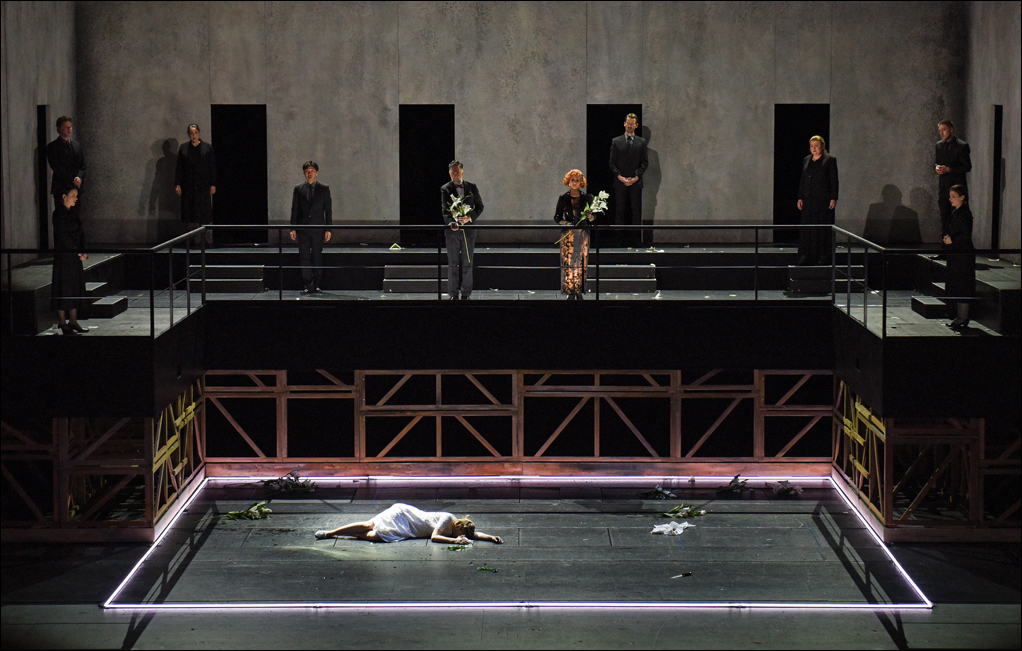 Trauer am Grab: Chor, Gunes Gürle (Capulet), Katarzyna Kuncio (Lady Capulet) und Lavinia Dames (Julia). Foto: Hans Jörg Michel.