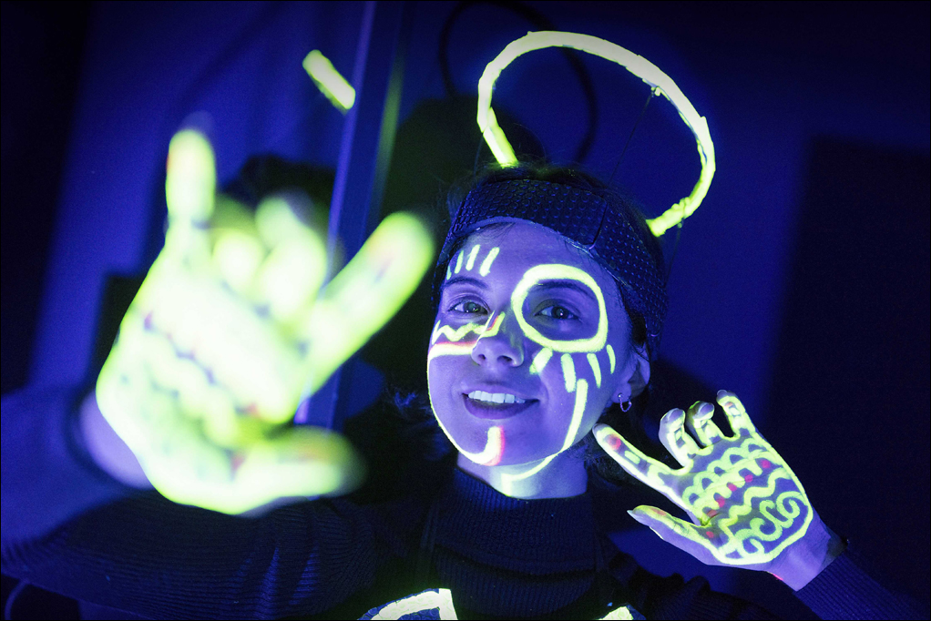 Die interaktive Tastausstellung SHAPE! lädt dazu ein, Skulpturen mit den eigenen Händen, nur getrennt durch dünne Handschuhe, im wahrsten Sinne des Wortes zu begreifen. Der eigene Körper kann mit Hilfe von fluoreszierenden Bodypaintings und Kostümen modelliert und umgedeutet werden. Foto: Ilja Höpping / Stadt Duisburg.