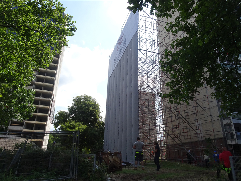 Der Weiße Riese ist reif zur Sprengung. Das Haus rechts schützen Gerüste. Foto: Petra Grünendahl.