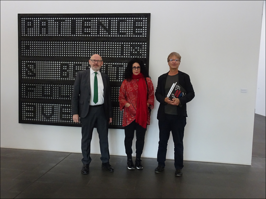 Kay Heymer, Susan Hefuna und Stephan Kunz (v. l.) vor einer Maschrabiyya im MKM Museum Küppersmühle. Foto: Petra Grünendahl.