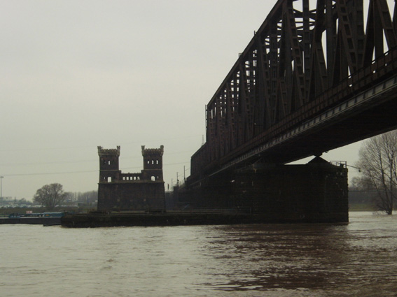 Duisburg, 12. Januar 2011: Eisenbahnbrücke über den Rhein von Hochfeld nach Rheinhausen bei Hochwasser, links im Bild Reste der alten Rheinquerung